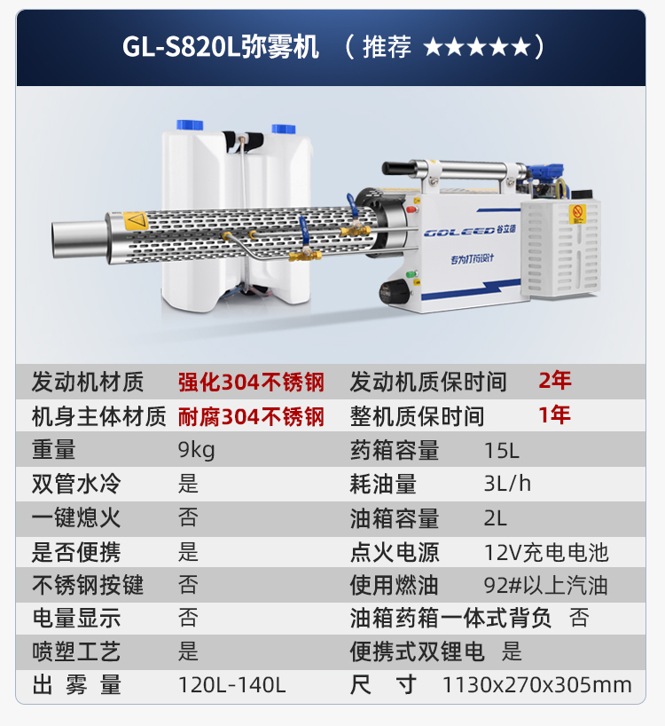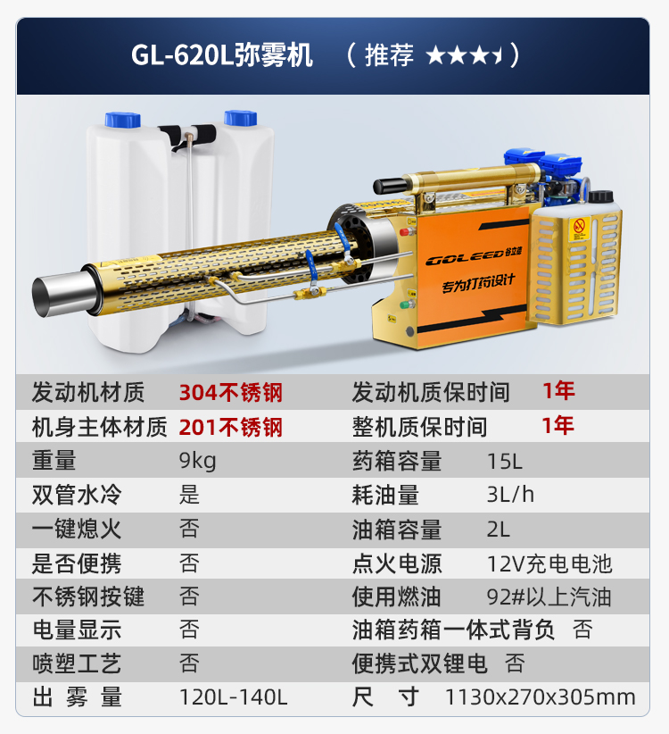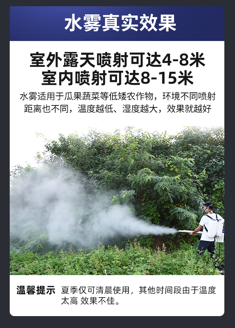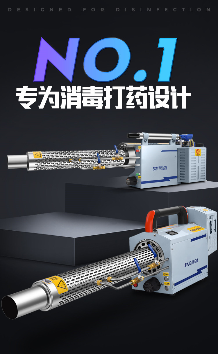 ②工作原理:散气机使用航天科技,它是由螺旋脉冲动力人发射原理衍生而来的,它马上将爆炸管中的药液粉碎成雾。雾化颗粒的直径只有大概0.5微米,然后用到高速和高压气流分散药品。液体以雾状喷出,快速扩散,喷向防治对象,达到病虫害防治和作物杀菌的目的,药液颗粒微小,扩散范围广。庄稼和地方被药烟合围。360度无死角。灭虫率可达98%以上,具备杀菌灭虫的效用,是喷洒农药,卫生防疫,消毒的完美产品。