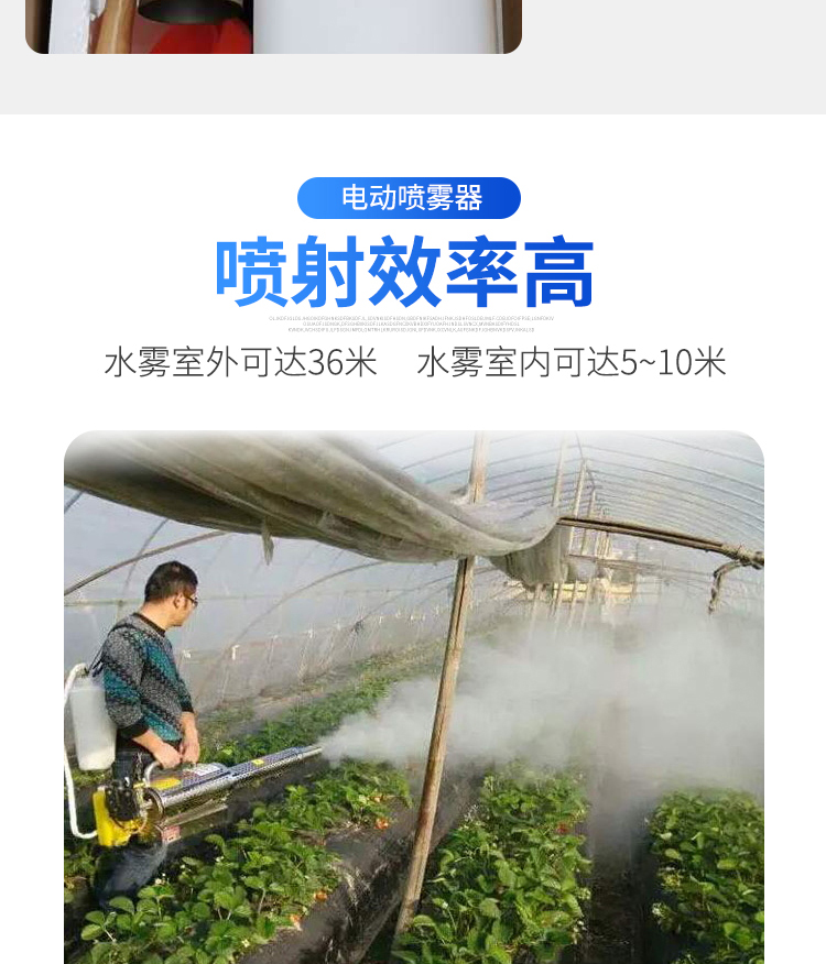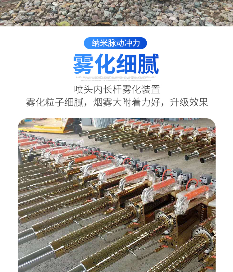 当 弥雾机工作时,脉冲式发动机(每秒60次爆炸)会从喷嘴的出口高速产生高温高压气流。敞开药阀后,药箱中的气压(发动机计量箱每秒钟充气60次以形成气压)。药液流入爆炸管并与高温,高速混杂。空气流动。在会面的那一刻,化学液体在1/60秒钟内爆炸并粉碎成微米微粒,然后排放到空气中以冷却以形成雾(烟)。喷嘴高速喷出并快速散播。当被操纵物体与烟雾或烟雾触及时,起到预防或治疗的功用